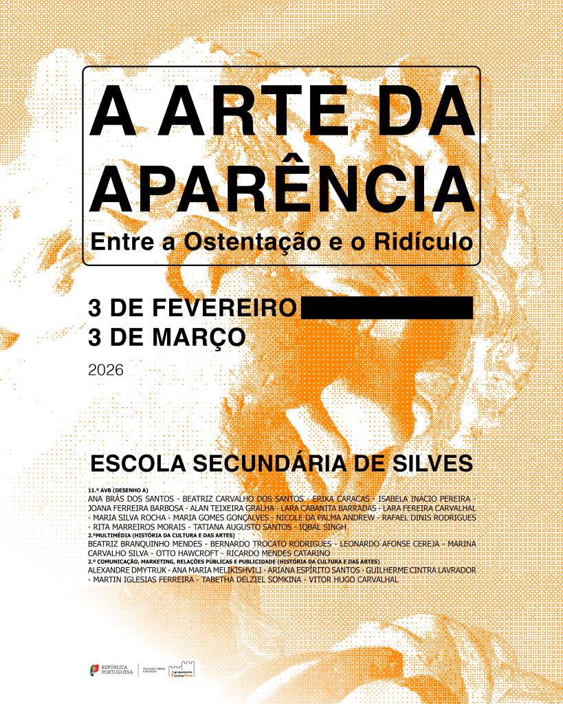 Os desenhos de grande formato realizados pelos alunos do 11.º AVB partem de pinturas barrocas para evidenciar a construção artificial do gesto, da pose e da autoridade. Em diálogo, a análise da peça “O Burguês Fidalgo”, de Molière, desenvolvida pelas turmas 2.º M e 2.º CMRPP, revela o lado satírico e ridículo dessa mesma lógica de imitação social.