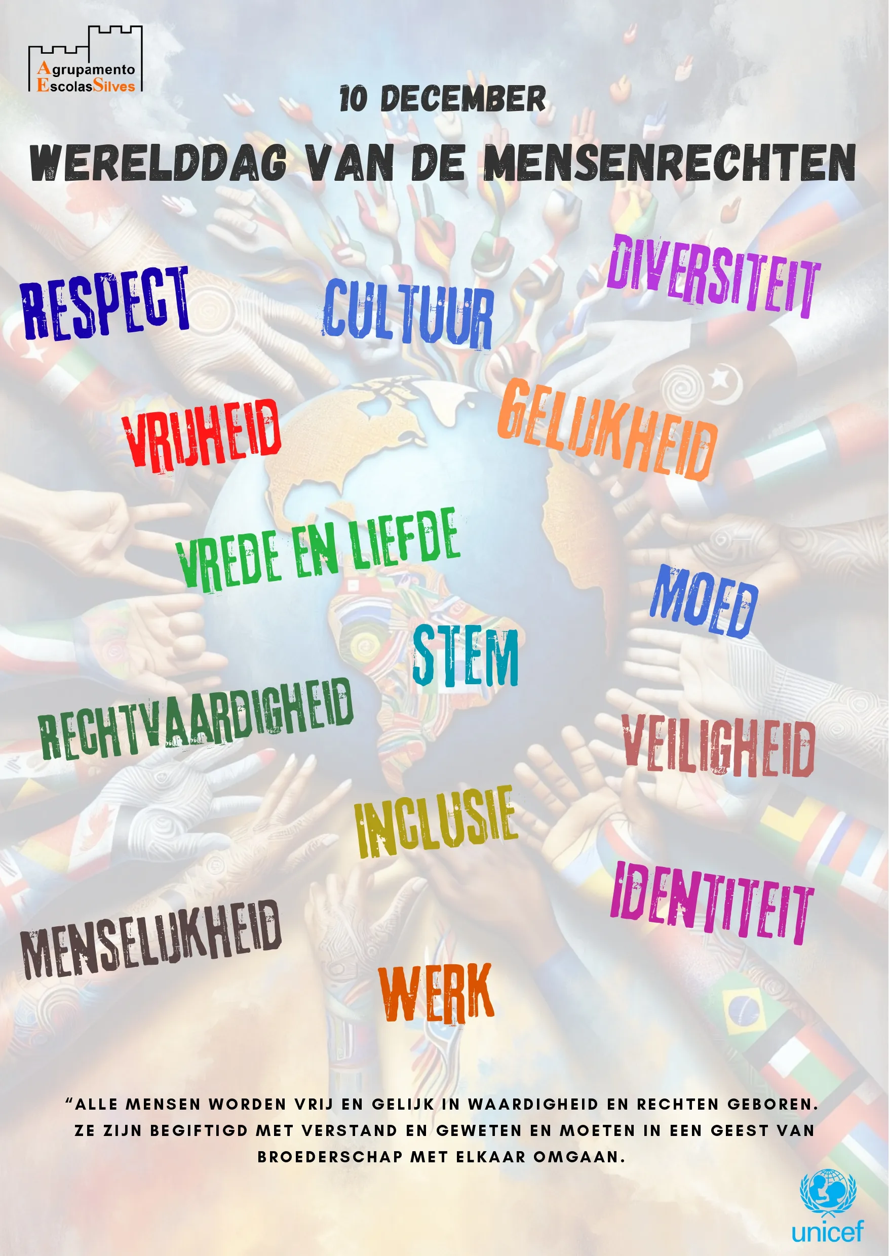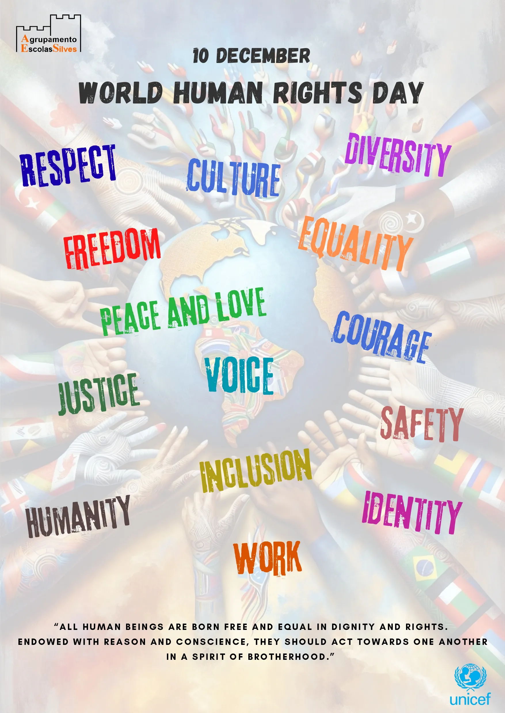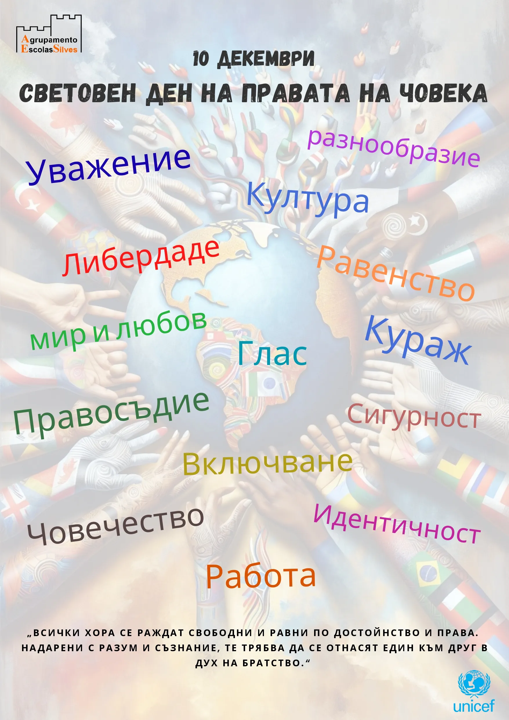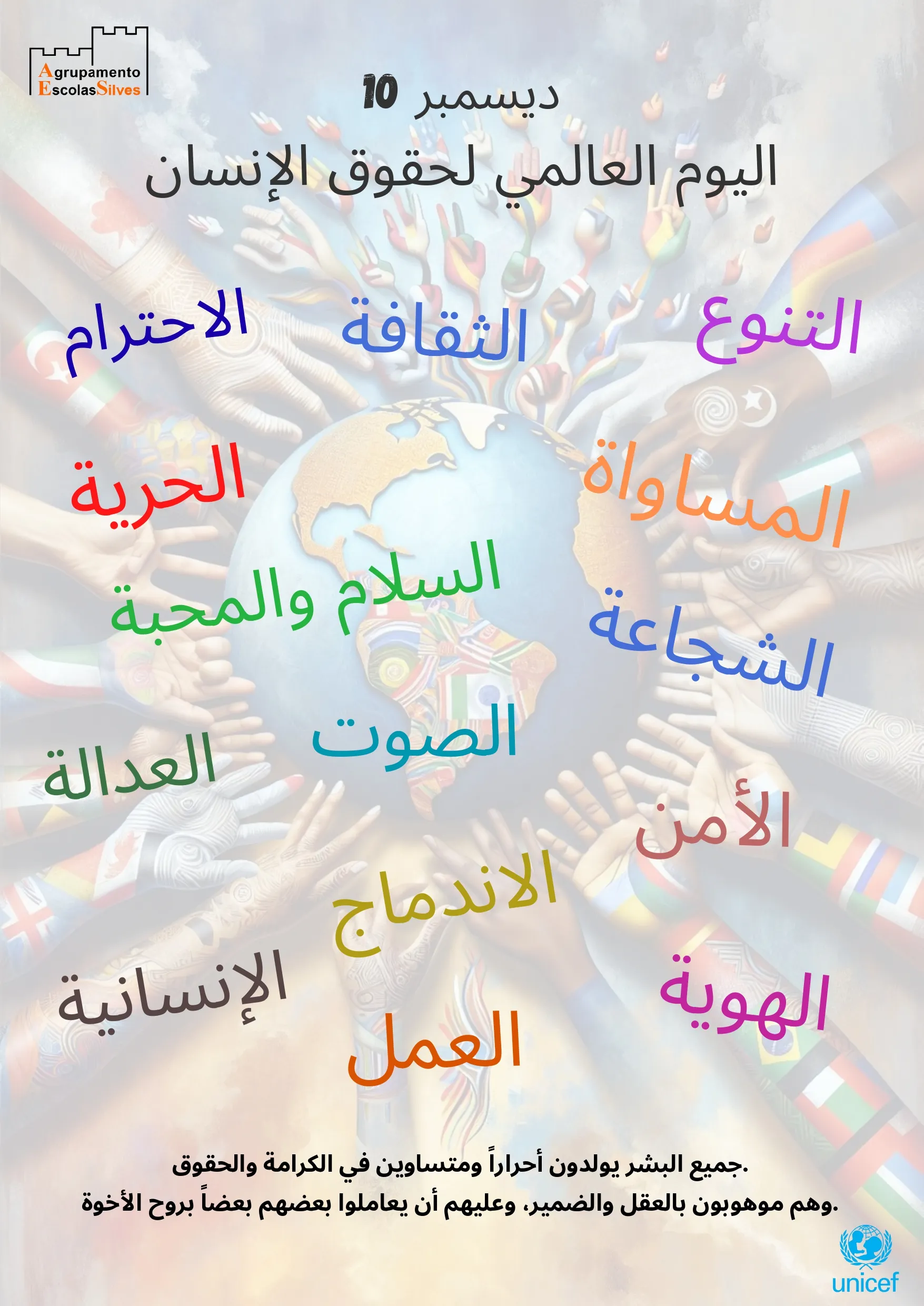 Para representar a diversidade presente no nosso Agrupamento, criámos um poster em cinco línguas — Português, Alemão, Búlgaro, Inglês e Árabe — reforçando que os Direitos Humanos pertencem a todos, independentemente da cultura, língua ou origem.